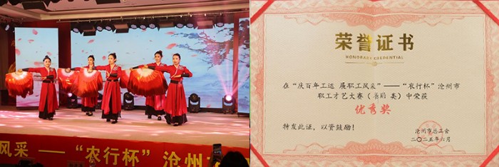 在5月7日下午结束的“庆百年工运 展职工风采”--“农行杯”沧州市职工才艺大赛(舞蹈组)决赛中,集团职工时红英、张建凤、杨婷、张静、杨丽用一场精彩的舞蹈《万疆》,赢得了评委和观众的高度赞誉,荣获舞蹈类优秀奖。 另外在歌曲类预赛中,集团原创...