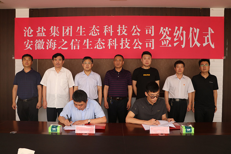 6月19日,沧盐集团生态科技公司与安徽海之信生态科技公司举行合作签约仪式,生态科技公司经理刘佳峰与安徽海之信生态科技有限公司董事长李岩分别代表双方签署合作意向书和供销合同。沧盐集团领导刘建军、文兴峰、李蜻海及相关部门负责人和合作方代表出席签约仪式。