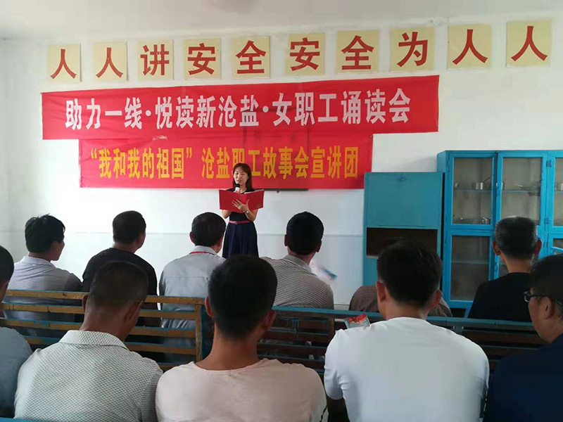 按照沧州市国资委“我和我的祖国”主题宣讲和市总工会关于深入开展“巾帼诵读新思想,砥砺奋进新时代”诵读活动要求,9月4日上午,工会女工委同宣传部联合举办了“‘助力一线・悦读新沧盐’暨‘我和我的祖国’沧盐职工故事宣讲”活动。三名女职工讲述了三代沧盐人开发大盐滩、建设大盐场、见证企业改革发展变化的切身经历,饱含深情、真挚感人,抒发了心系沧盐、奉献沧盐的自豪感和幸福感,弘扬了爱岗爱企爱国的家国情怀,表达了以实际行动向新中国70周年献礼的热情。