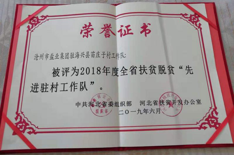 近日,沧州盐业集团驻苗庄子村工作队,被中共河北省委组织部、河北省扶贫开发办公室授予2018年度全省扶贫脱贫“先进驻村工作队”称号。