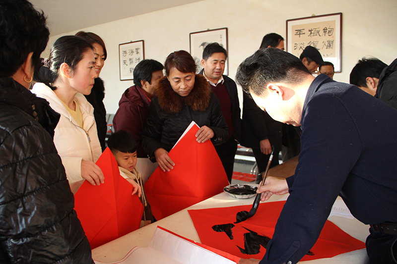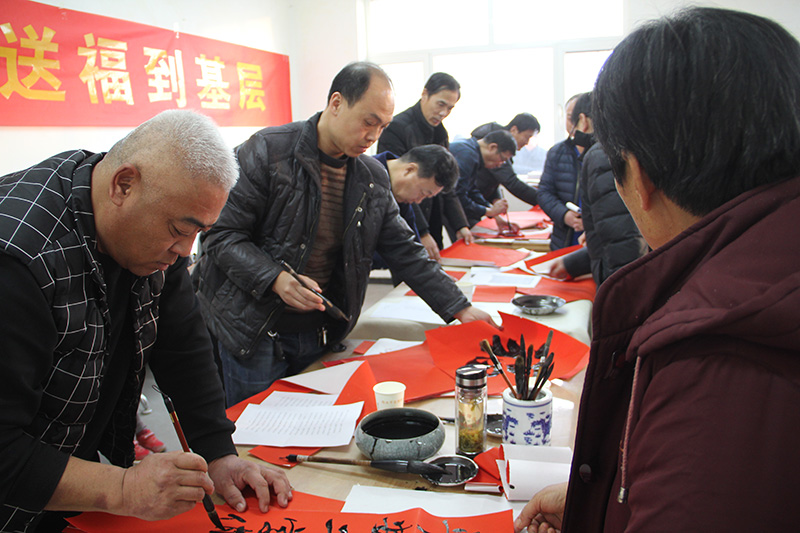 集团公司党委委员、纪委书记狄彬亲自带领集团公司书法志愿者,分别在青锋农场和原二分场大院,进行了现场书写,受到青锋群众及公司职工的欢迎。一幅幅喜庆的春联,一张张热情的笑脸,伴随着愉快的笑声,活动现场充满欢乐祥和的气氛。