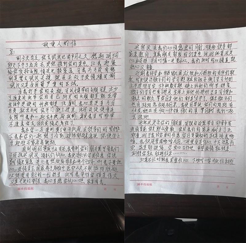 直到2月6日凌晨4点左右,我看到你的朋友圈写道:我们已经抵达武汉,请亲人们放心。我连忙给你发信息,你说当时情况紧急,让我照顾好母亲和两个孩子,让我不要担心,疫情当下,国家处于危难之中,医护人员不能临阵脱逃,必须要有一份担当。此时我觉得你很伟大,又无比坚强。我心想,你放心吧,家里有我!