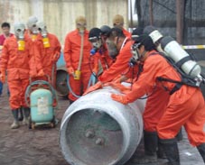 演练现场:应急队员将事故钢瓶推入液碱处理池