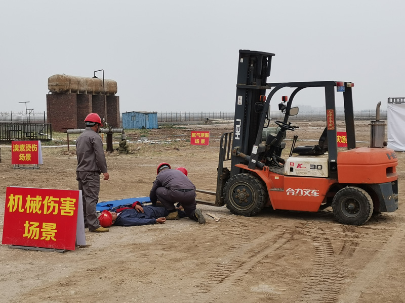 此次演练,分为模拟机械伤害、现场触电、火灾、危化品泄露、溴素烫伤等五项事故应急处置演练,并进行了正压式空气呼吸机使用和全封闭式防化服穿戴技能大比武。演练结束后,溴素公司还立即召开了现场会,总结经验、查找不足,研究了改进措施。