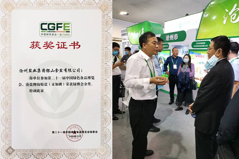 11月4日至11月8日,公司总经理张立庄带队赴福建省厦门市参加了第二十一届中国绿色食品博览会。"沧盐"牌未加碘海晶盐在众多参展产品中脱颖而出,获得本届博览会金奖。