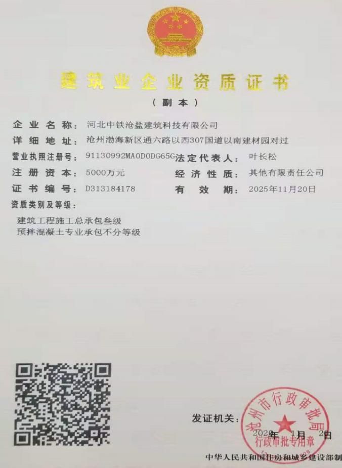 日前,河北中铁沧盐建筑科技有限公司经过积极跑办,如期取得了建筑工程施工总承包叁级和预拌混凝土专业承包不分等级两个资质。