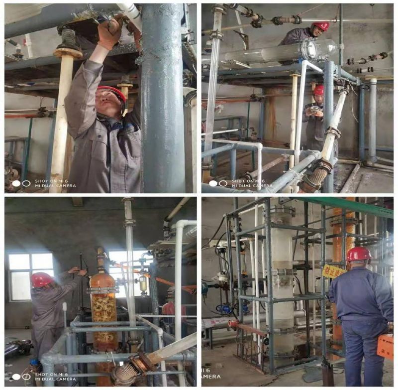 溴素二厂提取冷凝器设备因使用年限长,冷凝器内管有断裂且沉积物过多堵塞,冷凝效果降低,给溴的蒸馏冷凝及质量、产量带来影响。针对这种状况,厂班子研究决定对冷凝器进行集中更换。由于疫情影响,物流停运,春节前在石家庄预定的设备无法正常发货。为了能够完成生产任务,溴素二厂职工多次对冷凝器漏水部位采取封堵措施,坚持生产运行。