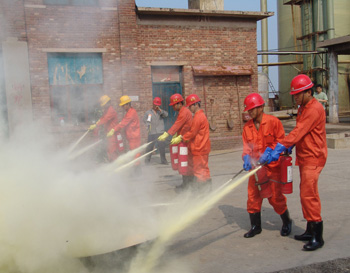 在模拟火灾现场,救援车辆满载救援队员及抢救器材、物资在第一时间进入现场,救援人员使用干粉灭火器,对准火源,迅速将火扑灭。与此同时,在模拟液氯钢瓶泄漏救援演练现场,液氯钢瓶发生泄漏,救援人员一面组织现场人员用湿毛巾捂住口,向上风口方向紧急疏散;一面佩戴专业空气呼吸器,身着防化服,用液氯捕消器对泄漏源实施氯气捕消和封堵,并将封堵后的钢瓶由叉车送到液碱池进行中和处理。在救援过程中,现场有一人氯气中毒,现场总指挥立即派出4名救援队员用担架将伤员移至安全地带,并同时向医疗急救中心和消防大队请求救援。随后,救护车、消防车先后赶到,医护人员迅速对受伤人员实施抢救,消防人员则马上启动消防设施,进行水雾空中喷洒,将空气中的氯气吸附,控制事故范围。事故处理完毕后,经现场毒气检测,空气中氯气含量降至安全水平。至此,2010年中盐长芦沧州盐化集团有限公司危险化学品及消防应急救援演练顺利结束。