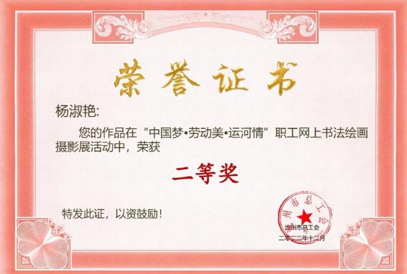 为了进一步营造喜迎二十大、建功新时代的浓厚氛围,展现全市经济社会发展的新面貌、新成就,展示工会工作的新亮点、新成效,展现职工群众的新风采、新贡献,进一步弘扬劳模精神、劳动精神、工匠精神,沧州市总工会开展了 “中国梦・劳动美・运河情”职工网上书法绘画摄影展活动。