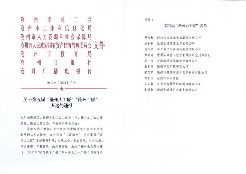 “沧州大工匠”是沧州市企业技能人才的至高荣誉,评选活动由市总工会、市工信局、市人社局、市国资委、市教育局、沧州日报社、沧州广播电视台等七部门于 2022 年 12 月联合开展,面向全市企业长期坚守生产一线、从事技能工作的技工精英。活动最终评选出沧州大工匠10名,沧州工匠10名。