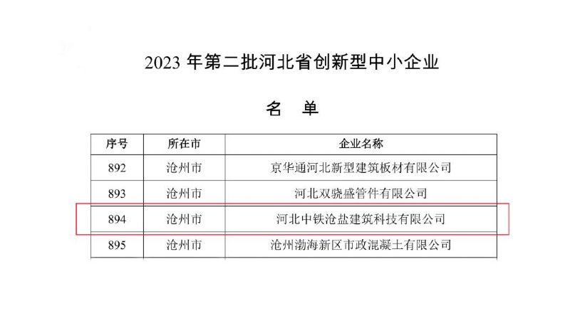 近日,河北中铁沧盐建筑科技有限公司获评河北省2023年“创新型中小企业”荣誉称号。