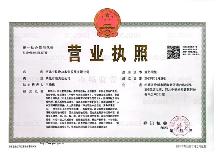 2023年12月29日,河北中铁沧盐木业发展有限公司注册成立,标志着沧盐集团引入央企三级子公司正式落地,华北进口木材产业园建设正式拉开序幕。