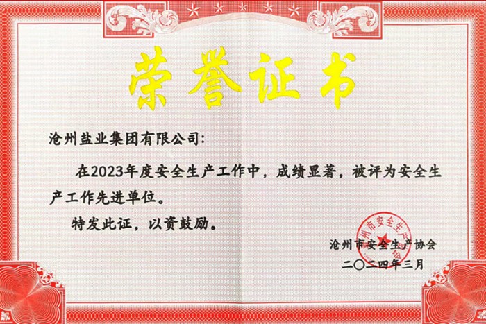 近日,沧州盐业集团有限公司荣获沧州市2023年度 “安全生产先进单位”荣誉称号,这是公司连续第11年获得该项荣誉。