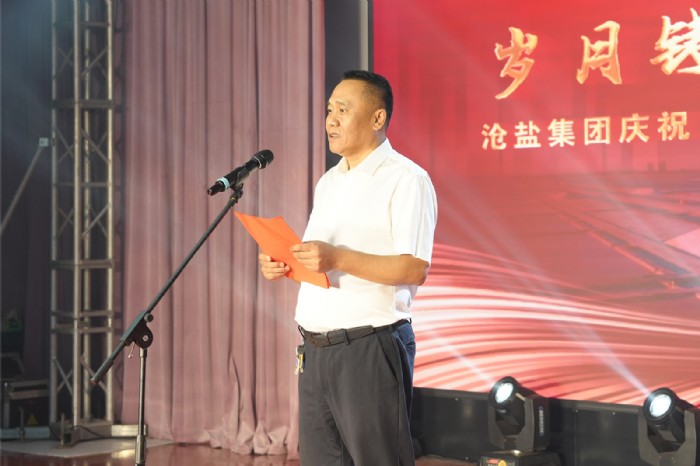 沧州市委宣传部副部长王超,沧盐集团党委书记、董事长刘建军分别致辞。王超在致辞中充分肯定了沧盐集团在66年的发展历程中取得的成绩。他指出,新时代,沧盐集团要实现高质量发展,必须高度重视思想政治工作,不断创新思想政治工作的方式方法,提高思想政治工作的实效性。在中华人民共和国成立75周年即将到来之际,庆祝祖国生日的同时,我们要居安思危,强化国防观念和忧患意识,增强干事创业的本领,团结一心、拼搏奋进,为实现沧盐集团的高质量发展而努力奋斗,为建设经济强市、美丽沧州做出新的更大贡献。