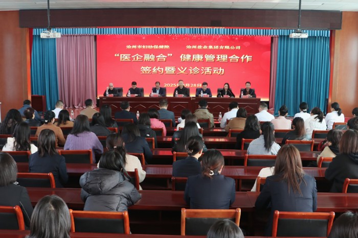 3月28日上午,沧盐集团与沧州市妇幼保健院“医企融合 共筑健康新未来”合作签约暨义诊活动在沧盐集团二楼小礼堂隆重举行。沧盐集团党委副书记、总经理张立庄,党委委员、纪委书记狄彬,沧州市妇幼保健院党委书记徐闻铂,党委委员、工会主席崔国光,渤海新区黄骅市卫健医保局副局长冯玉庆出席活动。活动由沧盐集团党委委员、工会主席崔国芳主持。