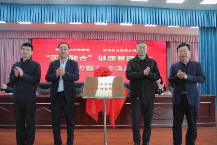 在参会人员的共同见证下,张立庄、徐闻铂分别代表沧盐集团、沧州市妇幼保健院签订了“医企融合”健康管理合作意向书。张立庄、狄彬、徐闻铂、崔国光共同为“医企融合”健康管理合作单位揭牌。崔国芳代表沧盐集团现场接受了沧州市妇幼保健院捐赠的1600余张健康服务卡。
