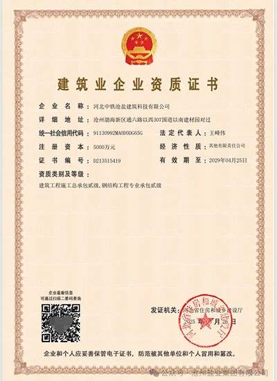 5月26日,河北中铁沧盐建筑科技有限公司成功实现了资质证书的升级,资质类别及等级正式提升为建筑工程施工总承包贰级、钢结构工程专业承包贰级。