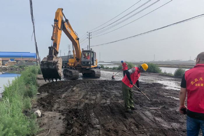 连日来,强降雨持续不断,为道路铺设带来很大的困难, 施工负责人现场指挥督导,职工们一边下管排水一边铺设道 路,将“工期意识 ”、“责任意识 ”融入每一个施工细节, 在保证工程质量和施工安全的前提下,全力以赴加快临道铺 设速度。