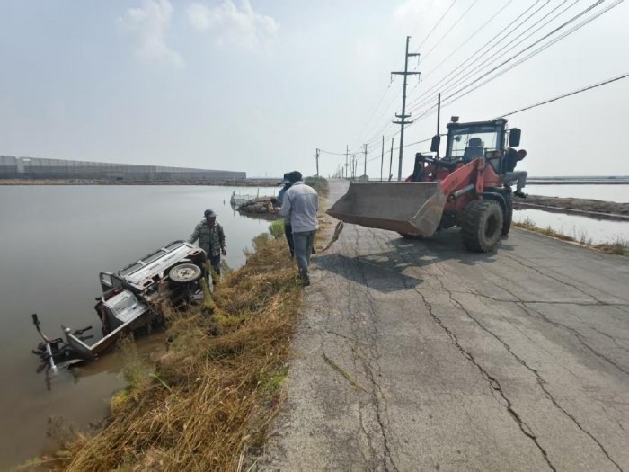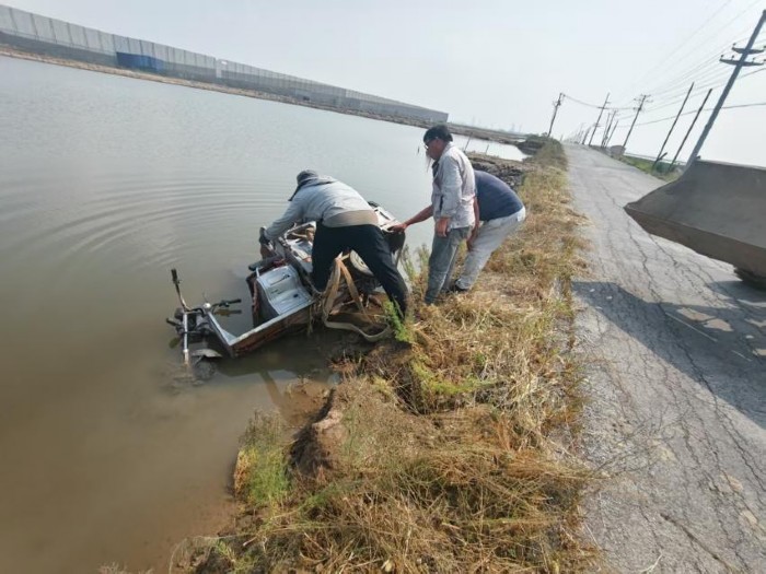 上午10时左右,海丰镇村民驾驶三轮车途经建筑工程公司东侧路段时,因避让车辆造成三轮车失控,连人带车冲入路北的水中。三轮车落水后迅速倾斜下沉,情况危急,村民大声呼救。