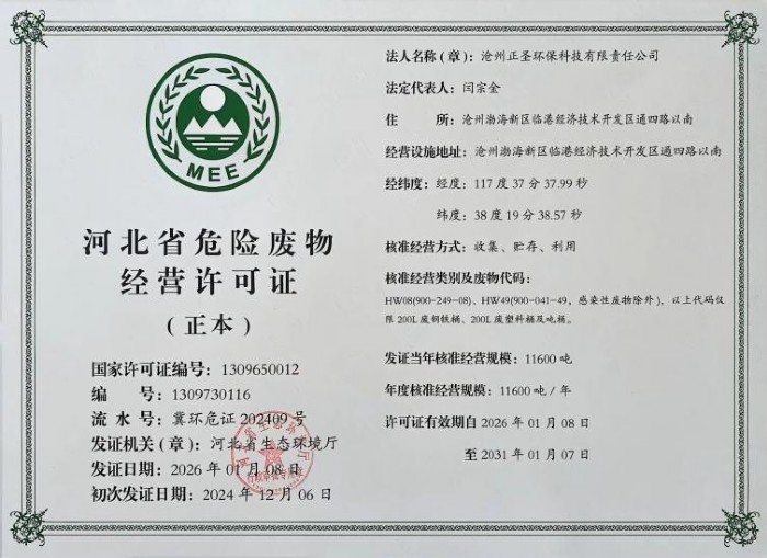1月12日,沧州正圣环保科技有限责任公司正式从河北省生态环境厅领取了新的《危险废物经营许可证》,标志着其为期一年的临时证照期满,成功换发为有效期五年的正式许可证。