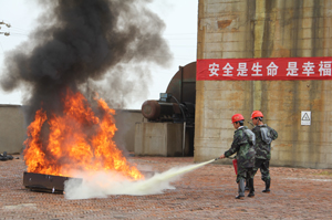 在模拟火灾现场,现场人员发现火情及时报告,演练指挥中心立即向救援突击队下达救援灭火命令。救援突击队第一时间进入现场,救援人员使用干粉灭火器对准火源实施灭火。由于火势太大,演练指挥中心下达启动消防设施的命令。救援突击队立即开启消防水泵,迅速将火扑灭。