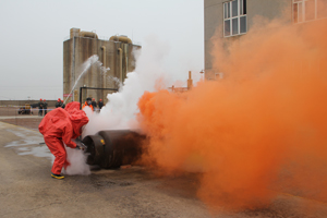 与此同时,在模拟液氯钢瓶泄漏救援演练现场,液氯钢瓶发生泄漏,工作人员立即拉响警报器,救援人员一面组织现场人员用湿毛巾捂住口鼻,向上风口方向紧急疏散;一面佩戴专业空气呼吸器,身着防化服,破开车间门、窗,用液氯捕消器对泄漏源实施捕消和封堵。救援人员发现现场有一人氯气中毒后,立即报告给演练指挥中心,指挥中心立即派出2名救援队员用担架将伤者移至安全地带,并组织医护人员迅速对伤者实施抢救。消防人员则马上启动消防设施,进行水雾空中喷洒,中和、吸附泄漏到空气中的氯气,降低危害程度,控制事故范围。事故处理完毕后,经现场毒气检测,空气中氯气含量降至安全水平。至此,中盐长芦沧州盐化集团有限公司2013年应急救援实战大演练到此结束。