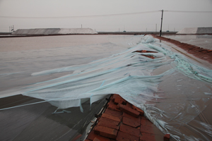 此次灾害性天气,造成公司生产场区大面积结晶塑膜被毁,部分苫封盐膜被掀。尽管各生产单元组织人员顶风冒雨对刮开撕裂的结晶池塑膜进行了紧急抢修,但由于塑膜受损面积大,仍造成部分结晶池卤水严重稀释,池存盐受到一定程度的损失,给即将到来的汛前制卤工作带来困难,对塑苫池雨季晒盐造成严重威胁。据统计,因飓风撕裂损坏塑膜5763公亩,彻底报废塑膜1140公亩,损坏滑道10160米,浮板1901米,宿舍、机房顶瓦被掀5500块,长度约1200米的盐码苫封塑膜被彻底损毁。