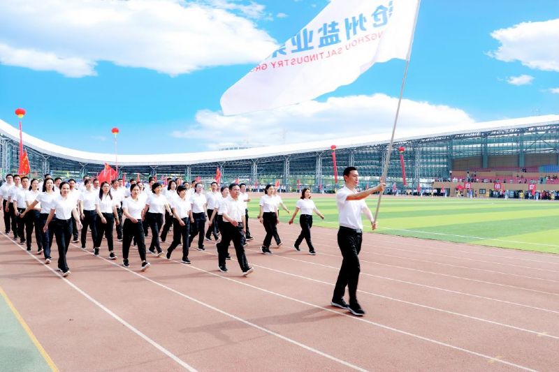 入场式中,我公司代表方阵高举沧盐集团旗帜,踏着激昂的运动员进行曲,高喊“沧盐沧盐勇往直前”,迈着整齐而有力的步伐走过主席台,充分展现了沧盐集团干部职工良好的精神风貌。